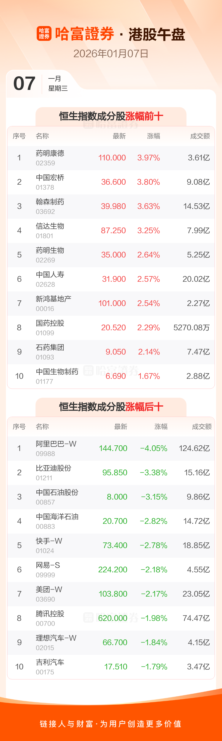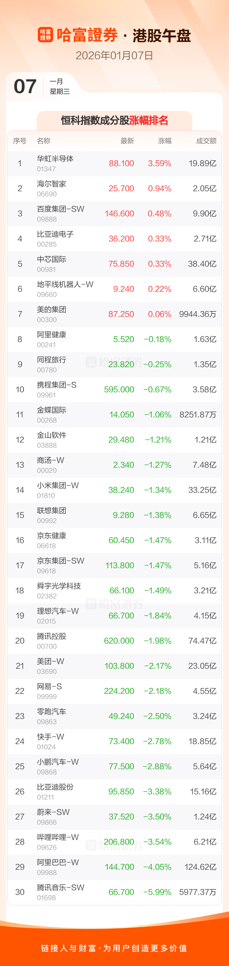 港股1月7日午盘走低,恒生指数及恒生科技指数均下跌。中药明康德等涨幅居前,阿里巴巴-W等跌幅靠前。本文基于AI生产,仅供参考。