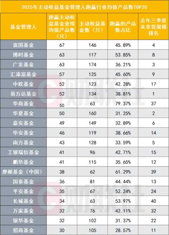 值得留意的是,在上述提及的基金管理人中,仅有华商基金不是非货基金规模前20的管理人,截至去年三季度末,该管理人在管非货基金规模排名第37名。但去年跑赢均值的主动权益基金数量,占该管理人旗下主动权益基金总数近八成。