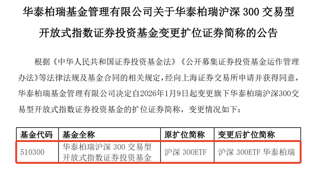 2026年1月7日,华泰柏瑞基金发布公告,旗下沪深300ETF的场内扩位简称调整为“沪深300ETF华泰柏瑞”,该变更将于2026年1月9日起生效。