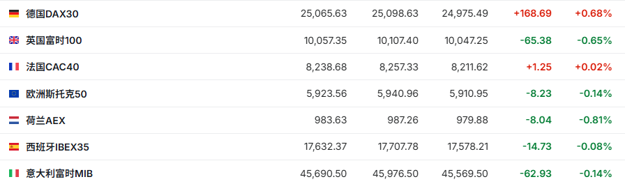 正在交易的欧洲股市涨跌不一,德国DAX指数现涨0.68%,英国富时100指数跌0.65%,法国CAC40指数涨0.02%。