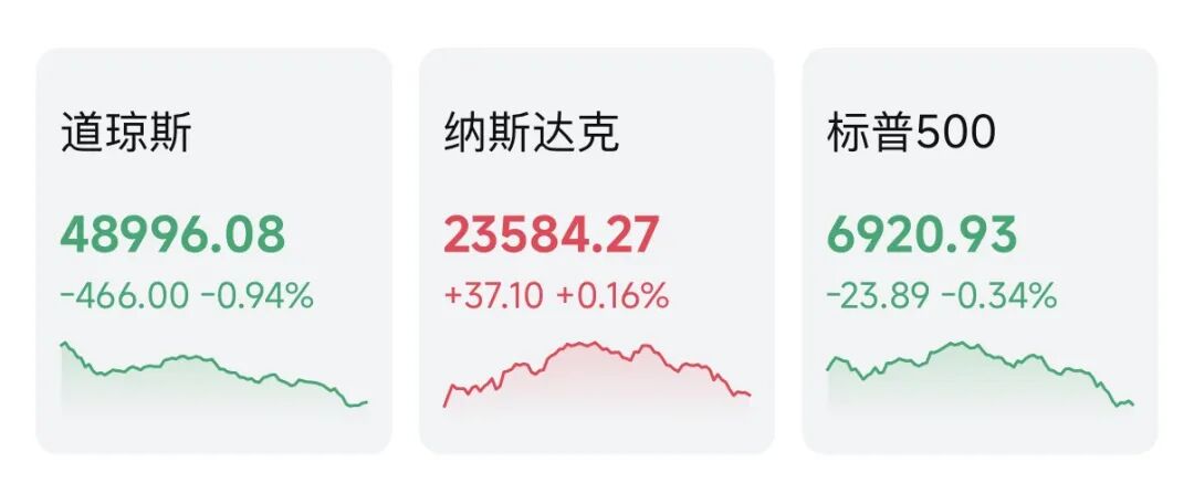 截至收盘,道指跌0.94%,报48996.08点;标普500指数跌0.34%,报6920.93点;纳指涨0.16%,报23584.27点。