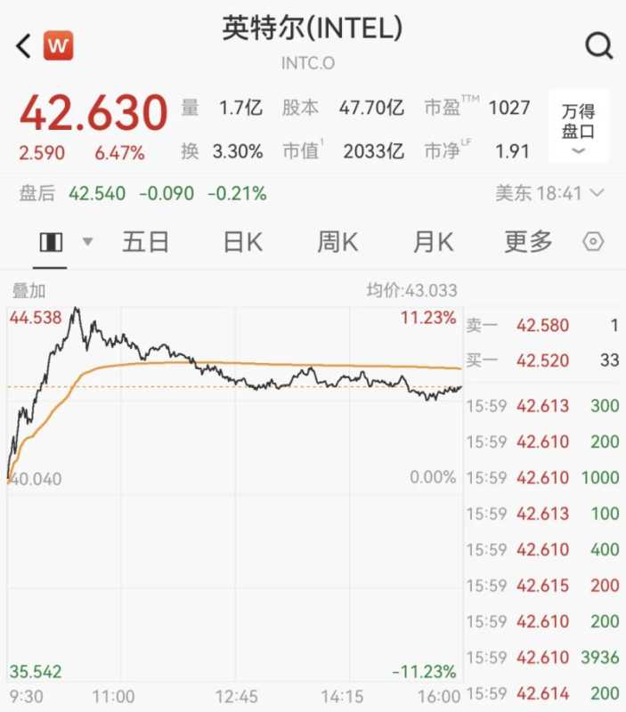 美东时间1月7日,英特尔盘中一度大涨超10%,之后涨幅回落。截至收盘,英特尔涨6.47%,报42.63美元/股,最新总市值为2033亿美元。