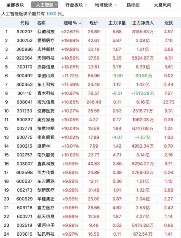 1月8日,人工智能板块延续强势表现,多只个股强势上涨。