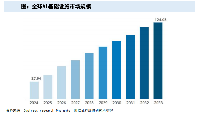 据预测,全球AI基础设施市场规模将在2024年279.4亿美元的基础上,以18.01%的年复合增长率持续扩张,预计到2033年达到124.03亿美元。