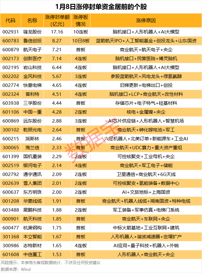 以封单金额计算,锋龙股份、鲁信创投、航天电子等涨停板封单资金较多,分别有17.16亿元、8.27亿元、7.21亿元,其中鲁信创投、航天电子为商业航天概念热门股。