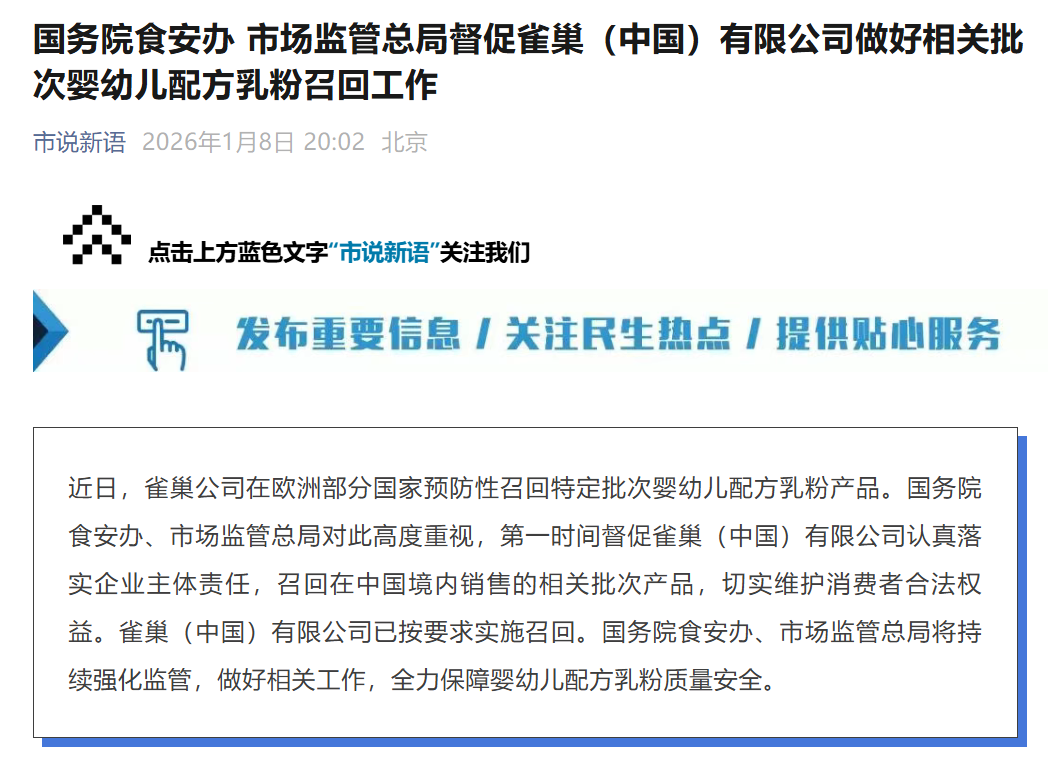 近日,雀巢公司在欧洲部分国家预防性召回特定批次婴幼儿配方乳粉产品。国务院食安办、市场监管总局对此高度重视,第一时间督促雀巢(中国)有限公司认真落实企业主体责任,召回在中国境内销售的相关批次产品,切实维护消费者合法权益。雀巢(中国)有限公司已按要求实施召回。国务院食安办、市场监管总局将持续强化监管,做好相关工作,全力保障婴幼儿配方乳粉质量安全。
