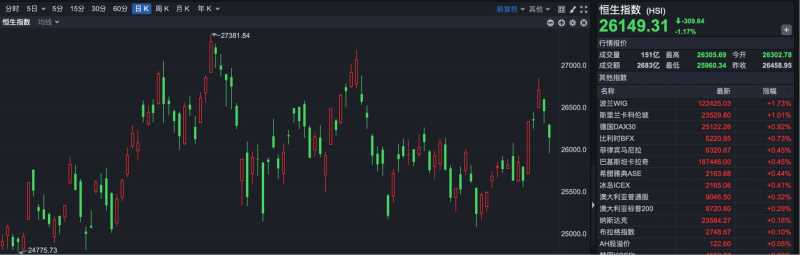 港股市场继续下挫,恒生指数报收26149.31点,下跌309.54点,跌幅1.17%。