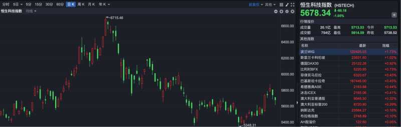 恒生科技指数报收5678.34点,下跌60.18点,跌幅1.05%。