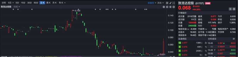 焦点公司方面,致浩达控股(HK01707)股价诡异拉升,盘中最大涨幅达到120%,最终收盘涨幅超过94.29%。截至今日收盘,致浩达控股市值约1.14亿港元。