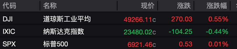 当地时间周四,美股三大指数涨跌不一,道指上涨0.55%,纳指下跌0.44%,标普500指数上涨0.01%,大型科技股多数下跌。中概股方面,纳斯达克中国金龙指数涨1.09%,热门中概股多数上涨。