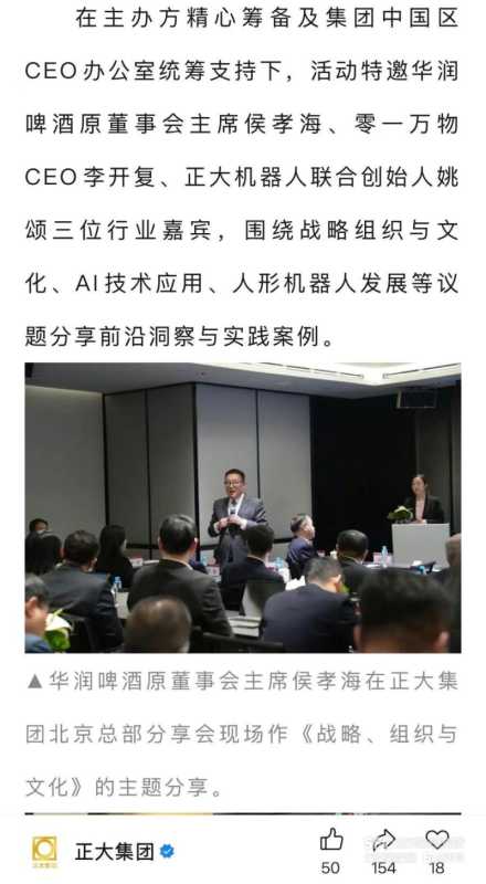 2025年11月的上海进博会期间,正大集团连续八年参展进博会,侯孝海以正大集团中国区资深专家顾问身份出席;12月18日至19日,正大集团中国区“高管真言”系列分享会首期活动《数字化及AI专题分享会》在北京总部召开,侯孝海出席分享会并现场作《战略、组织与文化》的主题分享。