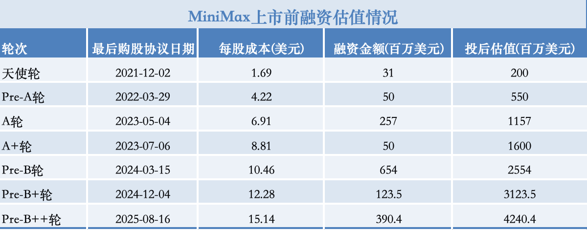 MiniMax成立于2021年,在上市前共历经了7轮融资。去年8月完成最近一轮3.9亿美元融资后,其估值超过42亿美元。