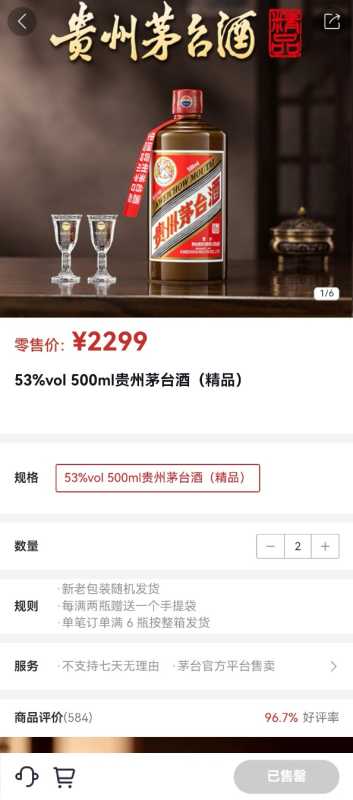 1月9日上午9点09分,2299元/瓶的精品茅台在i茅台APP上开售,记者留意到,不到一分钟,产品页面已显示“已售罄”,不同于1499元的飞天每5分钟补货一次,精品茅台页面未显示当日补货信息。