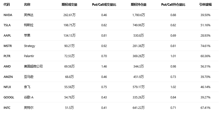 美股指数期权市场成交量下滑,看跌/看涨成交比上升。个股期权方面,Strategy收涨,观察显示大户以看多为主。同时,分析了期权成交量排行榜、引申波幅等信息。