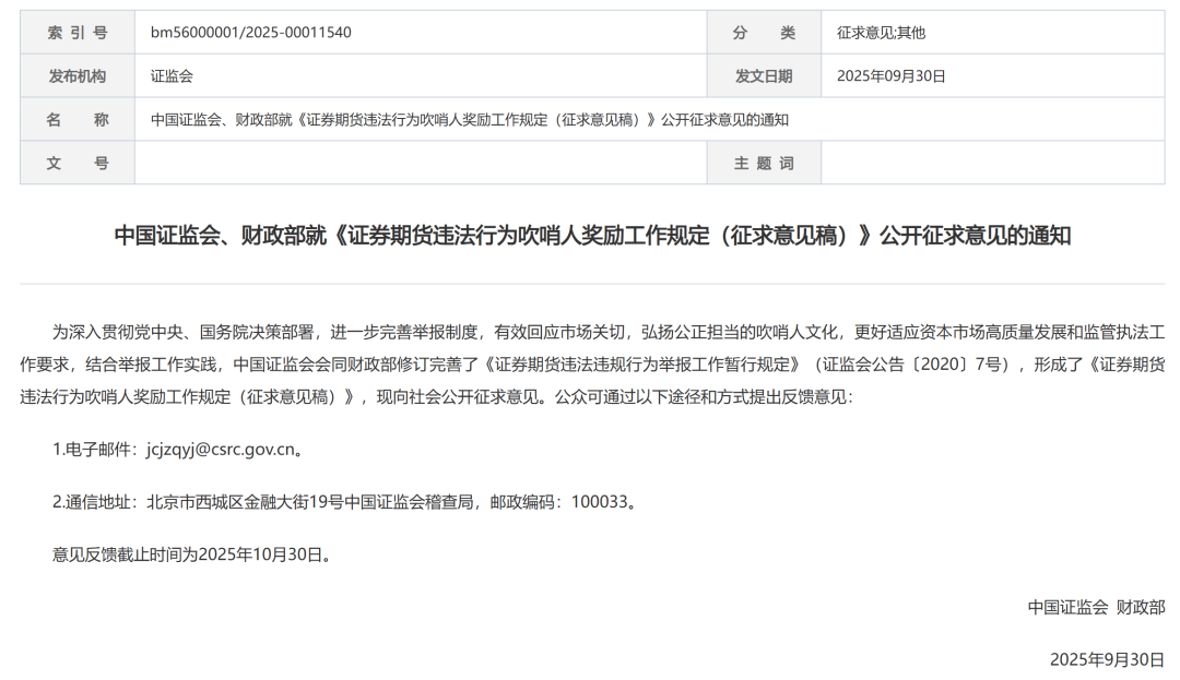 2025年9月30日,中国证监会、财政部发布就《证券期货违法行为吹哨人奖励工作规定(征求意见稿)》公开征求意见的通知。