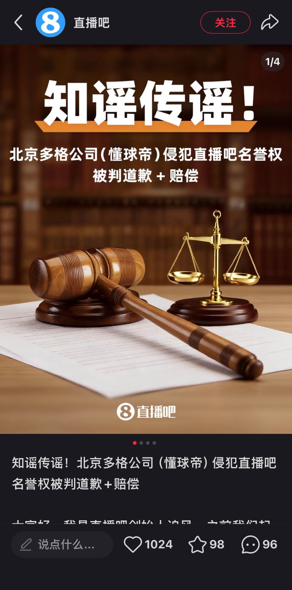 2025年12月29日,直播吧创始人林玉峰在一社交媒体平台的“直播吧”官方账号发文称,直播吧此前起诉北京多格公司(懂球帝),及其法定代表人陈聪侵犯名誉权一案已有一审判决。法院认定懂球帝构成名誉侵权,判令其公开致歉,并赔偿经济损失、维权合理支出及保全费用共计12.17万元。