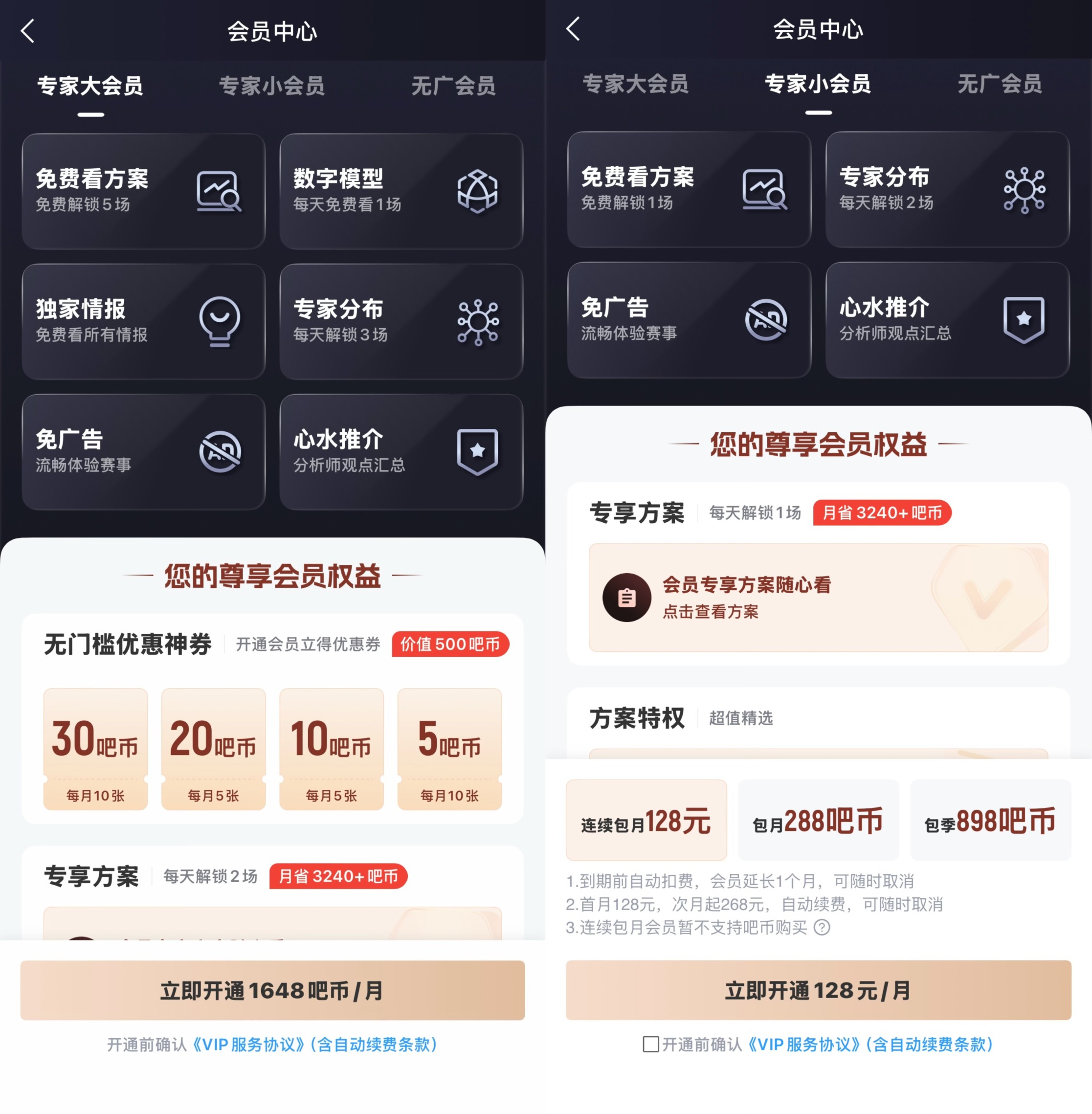 界面新闻记者发现,直播吧目前设有“专家小会员”、“专家大会员”两种会员模式,按月价格分别为“连续包月128元”、“1648吧币/月(即每月1648元)”。