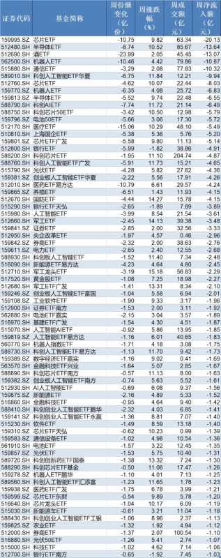 在资金流出方面,本周有72只行业主题ETF净流出逾1亿元,其中芯片ETF、半导体ETF和酒ETF份额分别减少10.75亿份、8.74亿份和23.99亿份,分别净流出资金20.13亿元、13.64亿元和13.07亿元。