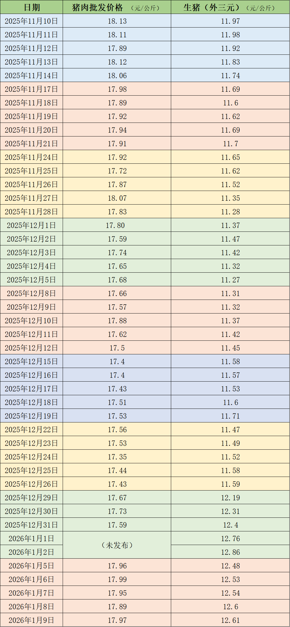 据农业农村部监测,1月9日,全国农产品批发市场猪肉平均价格为17.97元/公斤,与元旦节前2025年12月31日的17.59元/公斤相比,上涨2.2%。本周的平均价格为17.95元/公斤,与上周17.66元/公斤的均价相比,上涨1.6%。