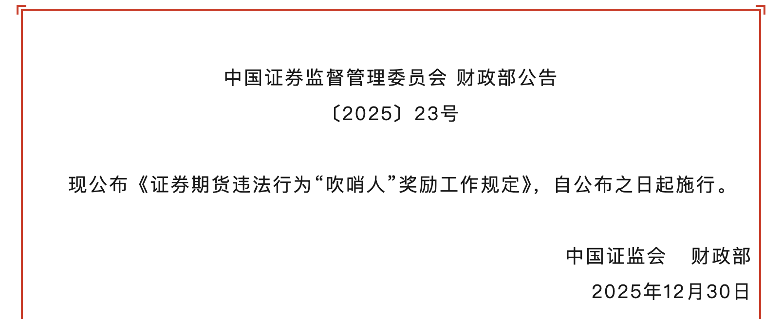 资本市场“吹哨人”制度迎来里程碑式升级。近日,证监会会同财政部正式发布《证券期货违法行为“吹哨人”奖励工作规定》,标志着“吹哨人”激励与保护机制正式生效。新规在奖励力度、门槛设定、程序优化及保护问责等方面实现系统性重构,旨在发动市场内部力量,精准打击重大违法违规行为。
