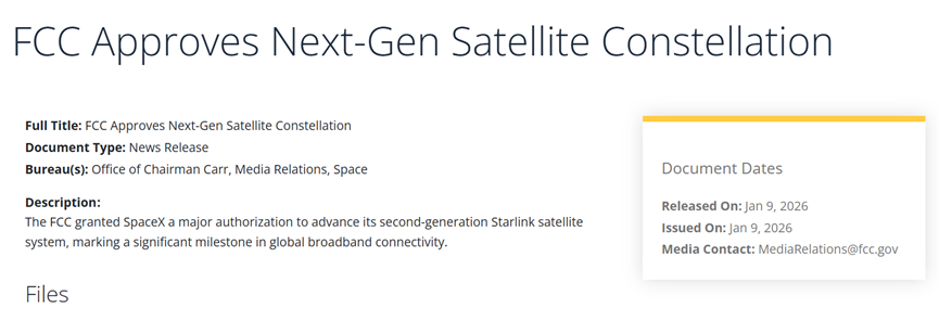 值得一提的是,当地时间1月9日,美国联邦通信委员会(FCC)批准下一代卫星星座计划,授权SpaceX在现有已部署8000颗卫星的基础上,增加部署运营7500颗Gen 2星链卫星。