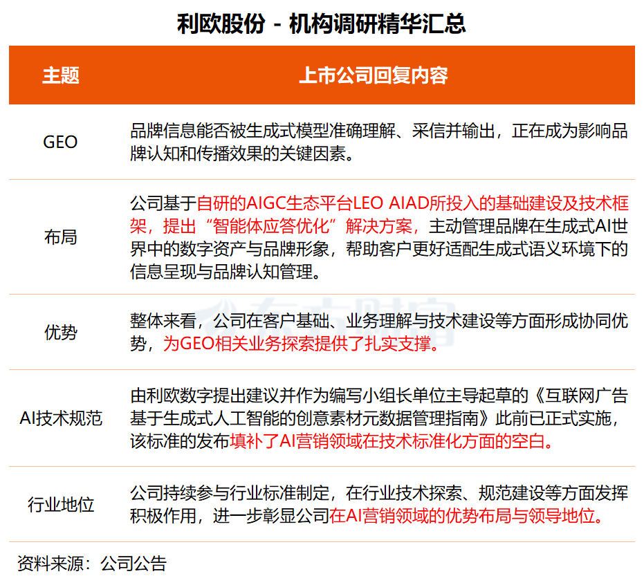 在调研中,利欧股份表示,公司在客户基础、业务理解与技术建设等方面形成协同优势,为GEO相关业务探索提供了扎实支撑。