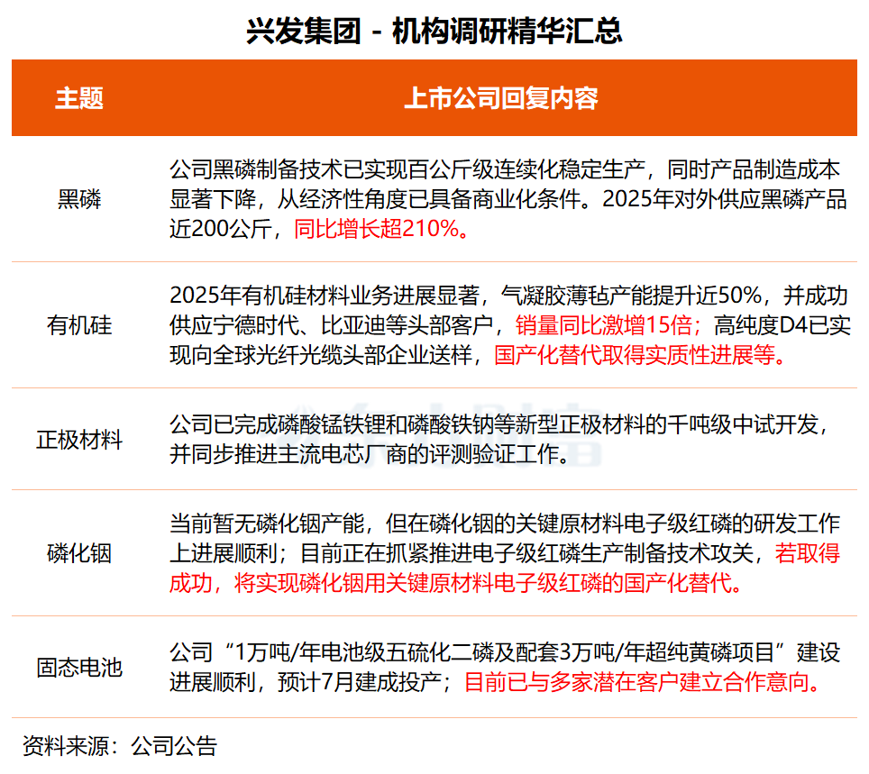 兴发集团近日接受华富基金、人保养老、华泰证券等20余家机构调研。兴发集团在交流中透露,公司在黑磷、磷化铟的关键原材料电子级红磷、新能源电池正极材料等领域的研发均取得积极进展。