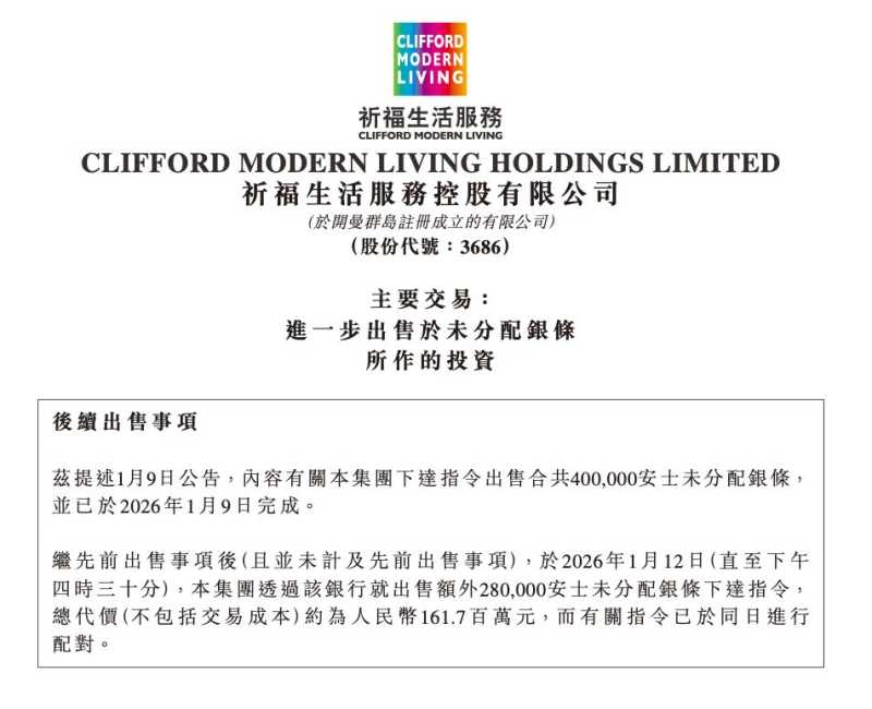 祈福生活服务在公告中表示:“投资未分配银条是作为本集团财务管理的一部分。经考虑未分配银条的当前市场趋势,尤其是近期市价已达近年最高,董事认为,现在是本集团变现部分未分配银条投资的合适时机。”