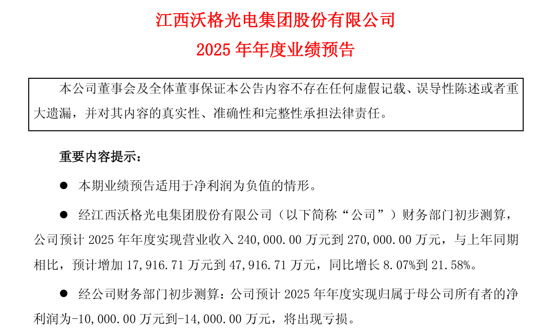 1月13日晚间,沃格光电(603773)公告称,公司预计2025年年度实现营业收入24亿元到27亿元,同比增长8.07%到21.58%;预计实现归属于母公司所有者的净利润-1.4亿元至-1亿元,将出现亏损。