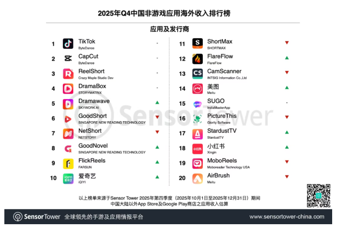 2025年四季度非游戏应用出海收入榜TOP20中,短剧应用占据半壁江山。另外,DramaBox在2025年全球收入大幅上涨75%至5.3亿美元,上市至今累计收入达8.5亿美元;2025年该应用下载量同比激增112%,跃居2025年全球短剧应用下载榜冠军。