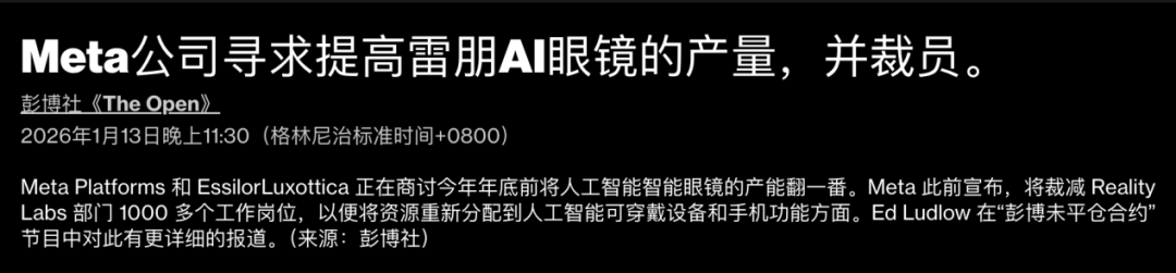 据彭博社近日报道,Meta Platforms和EssilorLuxottica正在商讨2026年底前将AI眼镜的产能翻一番。Meta此前宣布,将裁减Reality Labs部门1000多个工作岗位,以便将资源重新分配到人工智能可穿戴设备和手机功能方面。