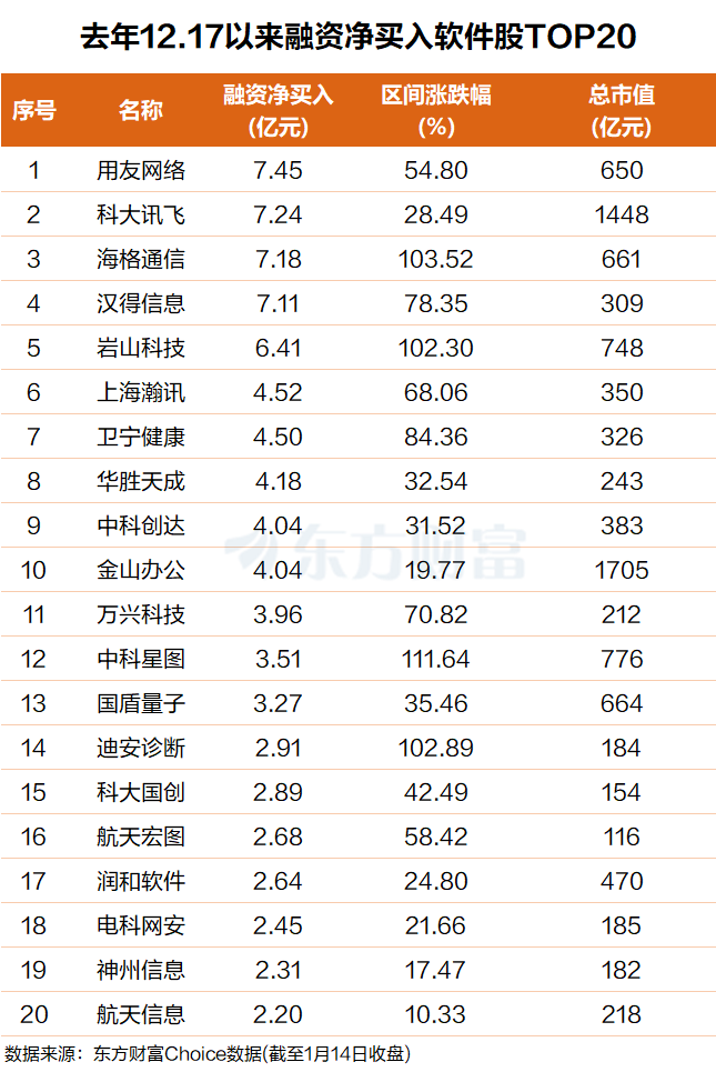 具体来看,用友网络排名第一,融资净买额7.5亿元,期间涨幅55%;科大讯飞排名第二,融资净买额7.2亿元,期间涨幅28.5%。