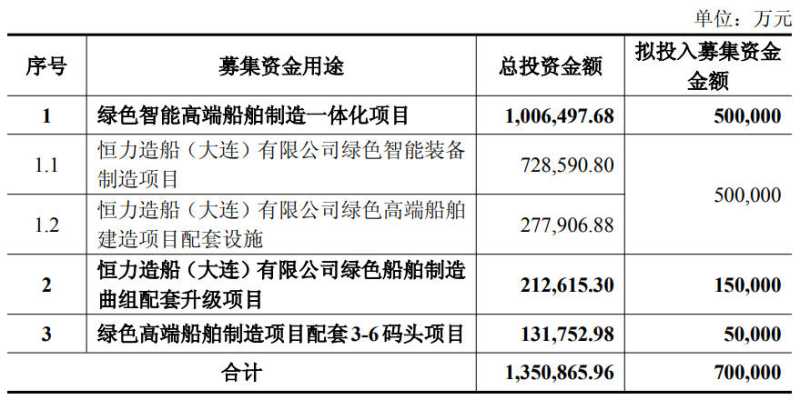 根据公告,此次向特定对象发行股票募集资金投资项目扣除相关发行费用后将用于绿色智能高端船舶制造一体化项目、恒力造船(大连)有限公司绿色船舶制造曲组配套升级项目和绿色高端船舶制造项目配套3-6码头项目。
