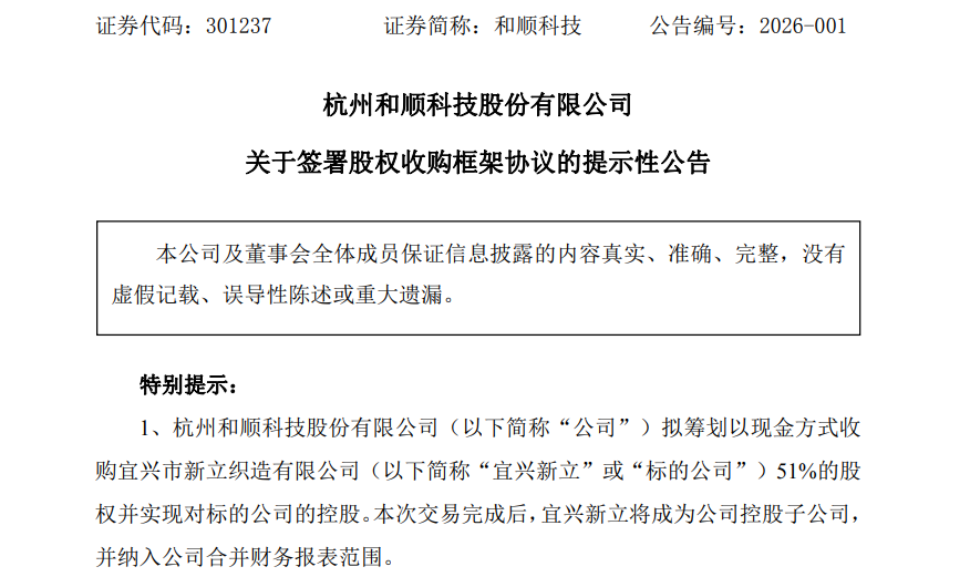 和顺科技强调,本次股权收购事项尚处于筹划阶段,签订的框架协议对公司本年度财务状况、经营成果的影响,需视协议各方后续正式协议的签署、合作的实施和执行情况而定,现阶段无法预计对公司当年经营业绩的影响。