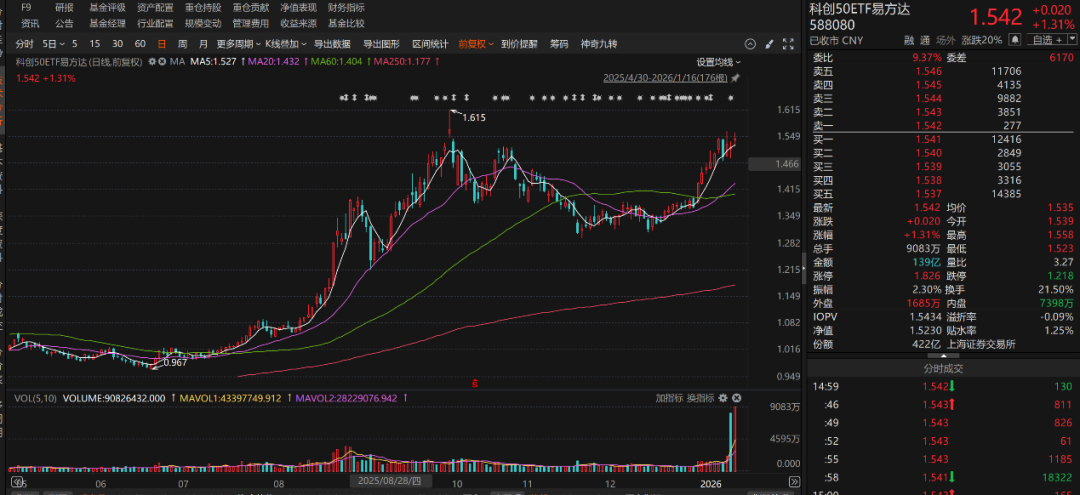从易方达科创50ETF的走势看,在下图中的成交额柱状图中,可以看出,1月15日成交量开始放大,1月16日成交额则是显著放大。