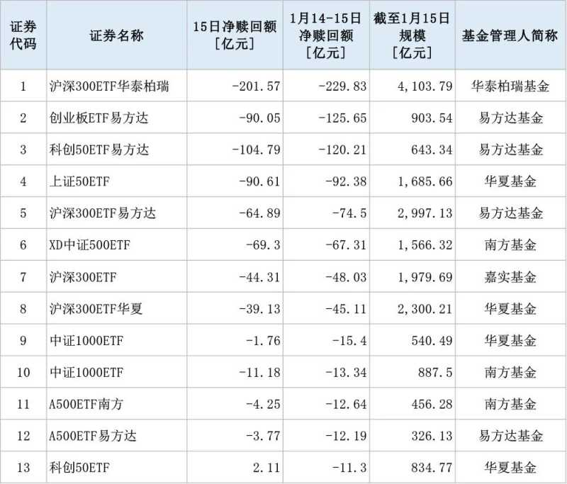 从具体ETF产品看,1月15日,多只ETF均遭遇大量赎回。其中,华泰柏瑞沪深300ETF净赎回201.57亿元,易方达科创50ETF净赎回104.79亿元,华夏上证50ETF、易方达创业板ETF净赎回均超90亿元。此外,南方中证500ETF净赎回69.3亿元,易方达沪深300ETF净赎回64.89亿元,嘉实沪深300ETF净赎回44.31亿元,华夏沪深300ETF净赎回39.13亿元。