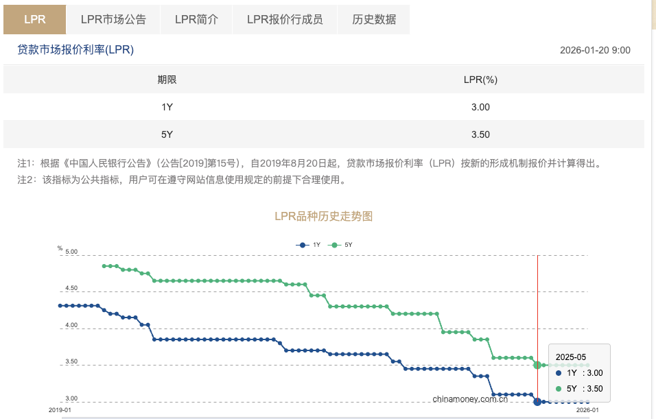 1月20日,最新贷款市场报价利率(LPR)报价出炉。其中,1年期LPR为3.00%,5年期以上LPR为3.50%,均与上月持平。这是自2025年5月两个期限LPR各下降10个基点之后,LPR连续8个月“按兵不动”。