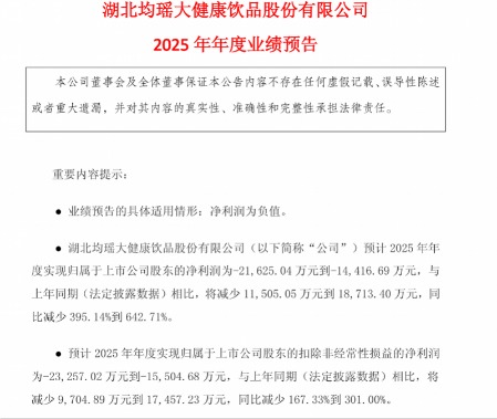 1月19日,均瑶健康发布2025年年度业绩预告,预计2025年实现归属于上市公司股东的净利润约亏损1.44亿元至2.16亿元,与上年同期相比,将减少约1.15亿元到约1.87亿元,同比减少395.14%至642.71%。