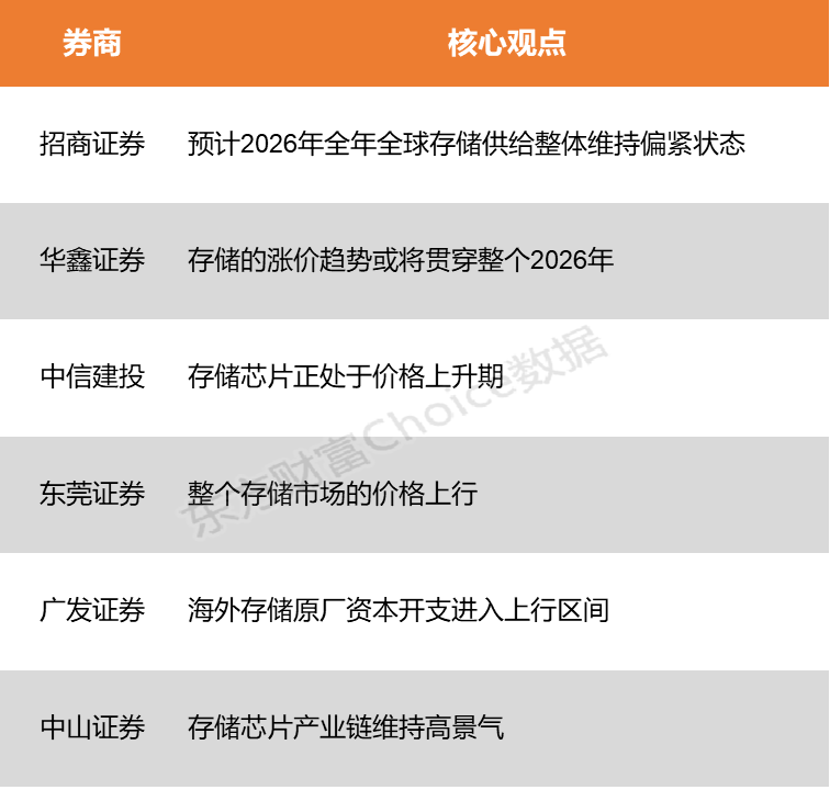 招商证券表示,全球存储价格从2025H1复苏上涨以来,2025Q3~Q4现货/合约价格加速上涨,近期逐步发现2026Q1各品类存储价格环比涨幅超预期,预计2026年全年全球存储供给整体维持偏紧状态。华鑫证券指出,存储龙头大幅涨价的底气,正来自对服务器DRAM短缺问题日益严重的预期。在这种情况下,存储的涨价趋势或将贯穿整个2026年。