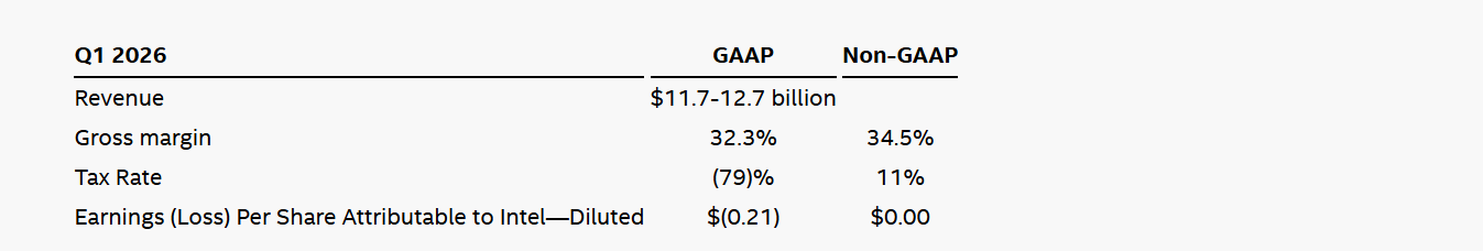 英特尔表示,预计第一季度营收在117亿美元至127亿美元之间,调整后每股收益0美元,即处于盈亏平衡水平。而LSEG预期第一季将实现每股5美分收益以及125.1亿美元营收。