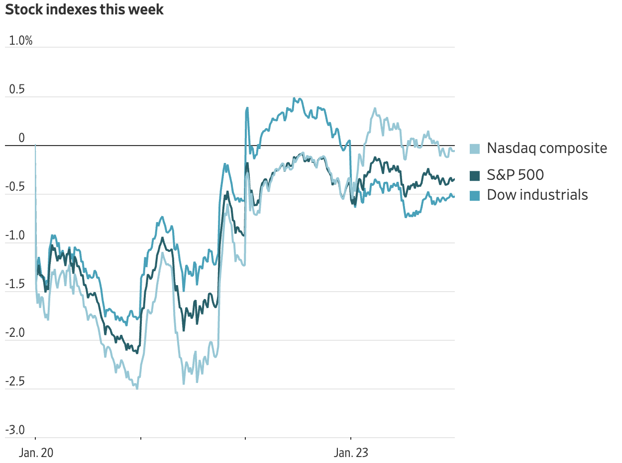 财联社1月24日讯 美东时间周五,三大指数涨跌不一,纳指小幅上涨,标普500指数微涨,道指跌近0.6%。