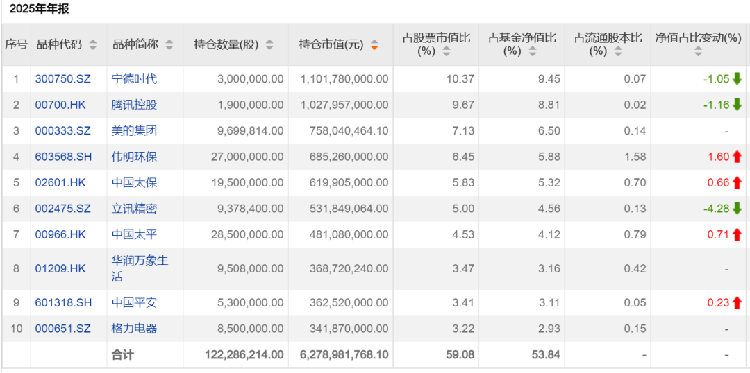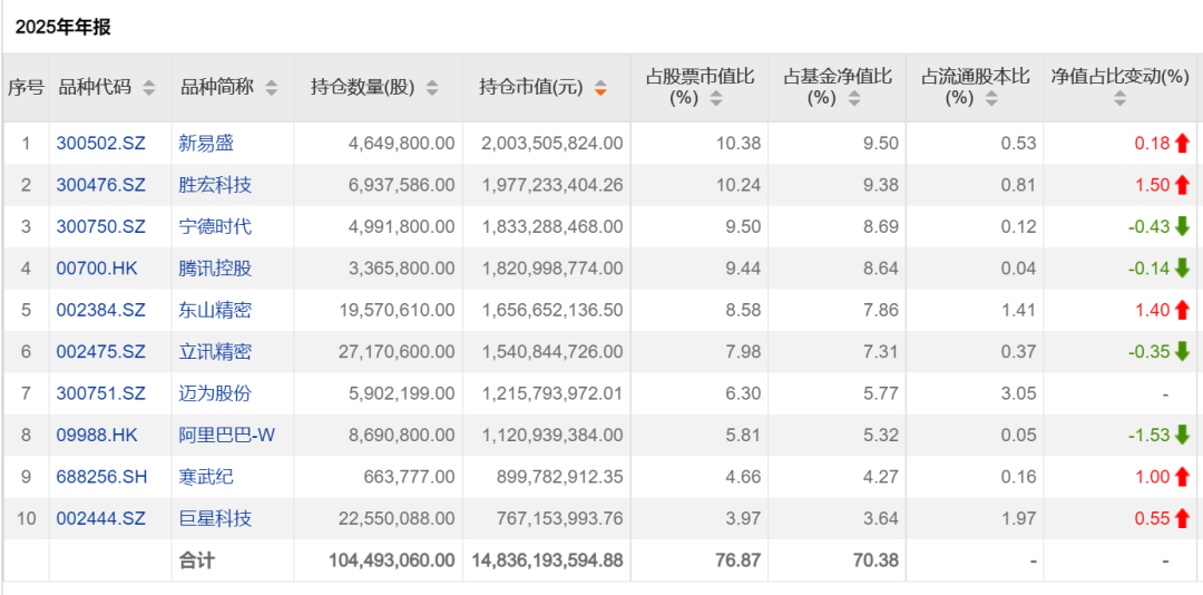 截至2025年底,傅鹏博管理的睿远成长价值混合基金的权益投资占基金总资产的90.48%,相比三季度末的89.93%有所提高。此外,前十大持仓市值在基金资产净值中的占比为70.38%,相比于三季度末的66.04%提升了4.34个百分点,重仓股的集中度提高。