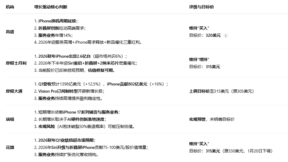 积极因素:iPhone 17系列需求强劲、服务业务稳健增长、供应链风险缓解、AI合作预期。