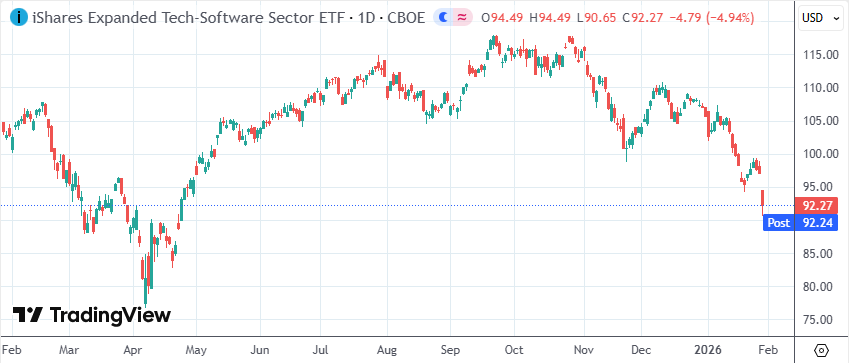 iShares扩展科技软件行业ETF(IGV)收跌4.94%,已较近期高点下跌22%,进入技术性熊市。