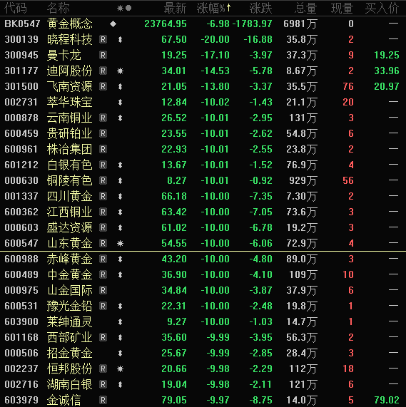 1月30日早盘,A股有色金属板块大面积跌停,贵金属板块大幅下挫,黄金股多数跌停,仅湖南黄金仍为红盘,山东黄金、中金黄金、招金黄金、四川黄金等纷纷跌停,龙头紫金矿业大跌超8%。