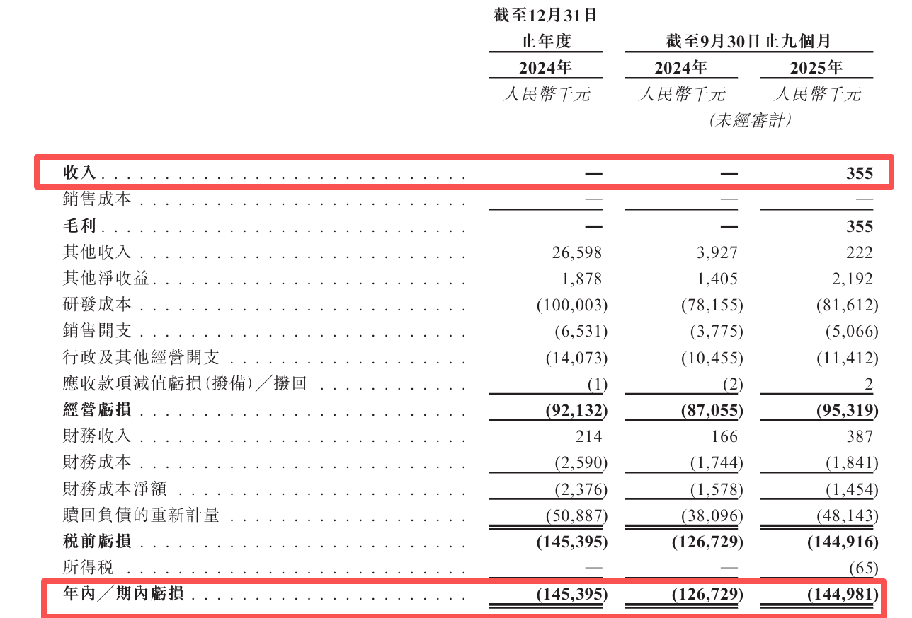 2024年及2025年前三季度(下称“报告期”),公司的收入分别仅0及35.5万元,主要来自为Cigalah Medpharm提供药品注册协助服务;期内亏损分别为1.45亿元、1.45亿元。与2024年前三季度1.27亿元的亏损相比,2025年同期亏损有所扩大。