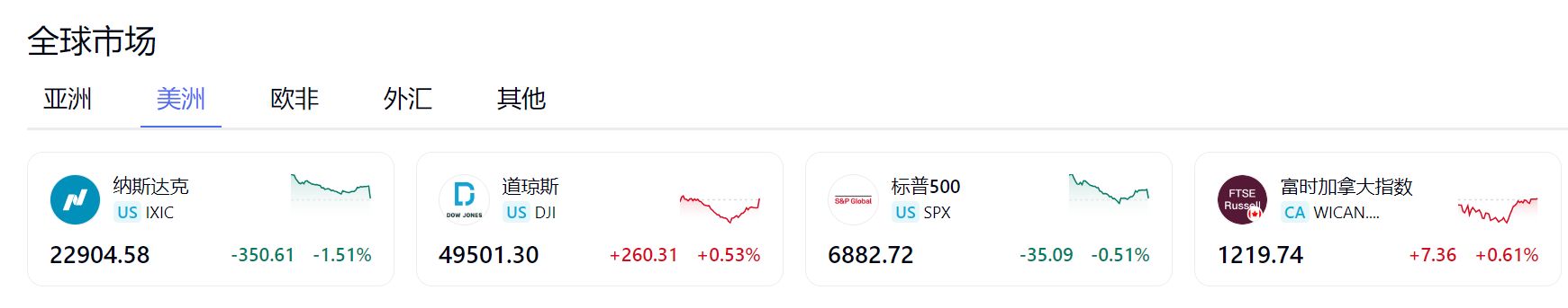 截至收盘,标准普尔500指数跌0.51%,报6882.72点;纳斯达克综合指数跌1.51%,报22904.58点;道琼斯工业平均指数涨0.53%,报49501.3点。连续两日下跌后,纳指也跌破了100日均线。