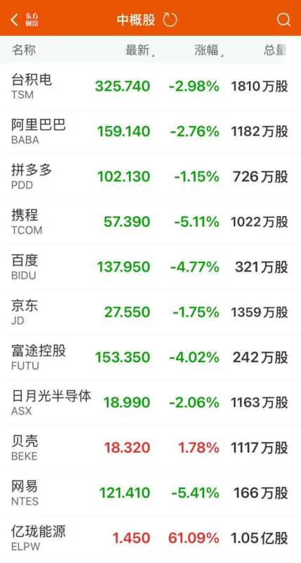热门中概股普跌,纳斯达克中国金龙指数收跌1.95%,哔哩哔哩跌超6%,百度跌超4%,阿里巴巴、蔚来、小鹏汽车跌超2%,理想汽车、霸王茶姬涨超1%。