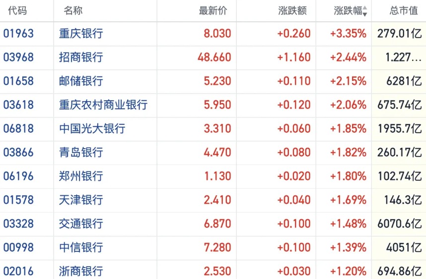 截至发稿,重庆银行(01963.HK)涨超3%,招商银行(03968.HK)、邮储银行(01658.HK)均涨逾2%。青岛银行(03866.HK)等城商行也明显跟涨。