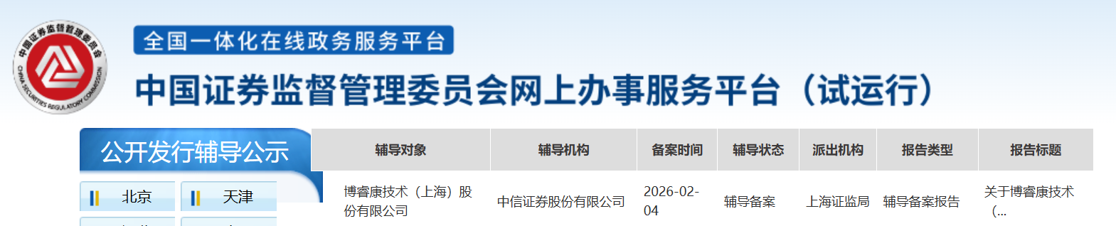 上证报中国证券网讯(记者王墨璞嘉)2月5日,记者从中国证监会官网获悉,脑机接口企业博睿康技术(上海)股份有限公司(简称“博睿康”)已于2月4日在上海证监局办理辅导备案登记,拟首次公开发行股票并上市,上市板块瞄准科创板,辅导券商为中信证券。